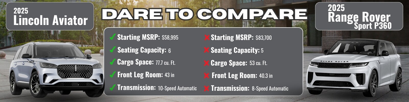 For luxury SUV enthusiasts comparing the 2025 Lincoln Aviator vs Range Rover Sport P360, the Aviator offers a winning combination of power, space, and value. While the Range Rover Sport starts at a premium $83,700, the Aviator comes in at a much more affordable $58,995, saving buyers nearly $25,000. Despite the price gap, the Aviator delivers more performance with 400 horsepower and 415 lb.-ft. of torque, outmuscling the Range Rover Sport's 355 hp and 369 lb.-ft.